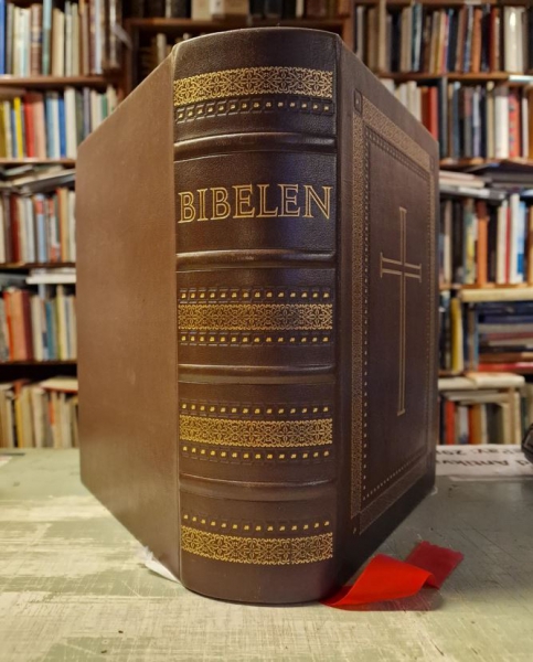 BIBELEN. Typografi ved Austin Grandjean - Det gamle testamentes kanoniske bøger, de apokryfiske bøger og det nye testamente. Bibelleksikon og bibelatlas. 4°. Med farvelagte plancher gengivet efter verdensberømte kunstværker, 4°,farvetavler + 16 kortplancher og kortindex, orig. kalveskind med blindtryk på ryg og forperm.