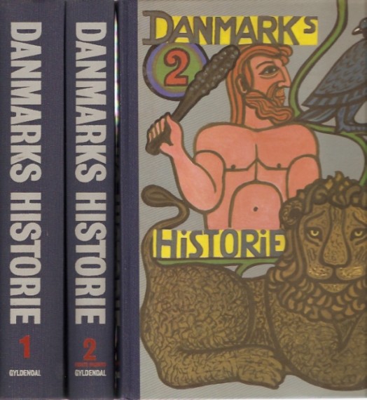 Dimensioner: Stor 8vo Type: Indbundet Gyldendals Danmarks-historie. Bind 1, Tiden indtil 1340, af Inge Skovgaard-Petersen, Aksel E. Christensen og Helge Paludan. Bind 2, Tiden 1340-1648, er delt i to halvbind, første halvbind (1340-1559) af Kai Hørby og Mikael Venge; andet halvbind (1559-1648) af Helge Gamrath og E. Ladewig Petersen. Tre uniforme halvlærredsbind med omslagsillustration af Henry Heerup. Generelt et pænt sæt (bd. 1 er dog lidt småskrammet på bagperm plus med en blegestribe øverst samme sted). Indhold er rent og pænt (uden indstregninger og lign.).