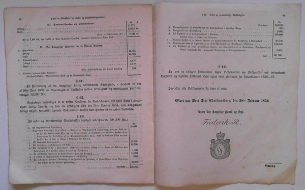 Forlag: Christiansborg Slot, den 28de februar 1856 - Udgivet år: 1856 - Antal bind: 1 - Antal sider: 31 - Indbinding: Hæftet. - Tilstand: Nogle brune pletter og fold på 1. side -